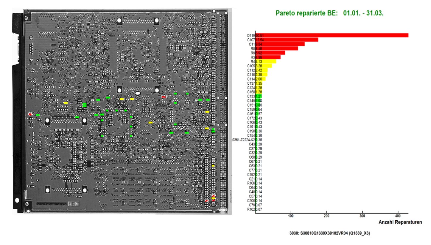 - Mehr als 150 verschiedene Auswertungen: z. B. Auftragsauswertung, Prüfkennzahlen, PPM-Berechnungen, First-Pass-Analysen, Test- und Board-Summary, Prozess- und Prüfmittelfähigkeitsanalyse, Bauelementedefekte (Artikelnummern), Reparaturaktionen, Trendauswertungen, Testerauslastung und viele mehr